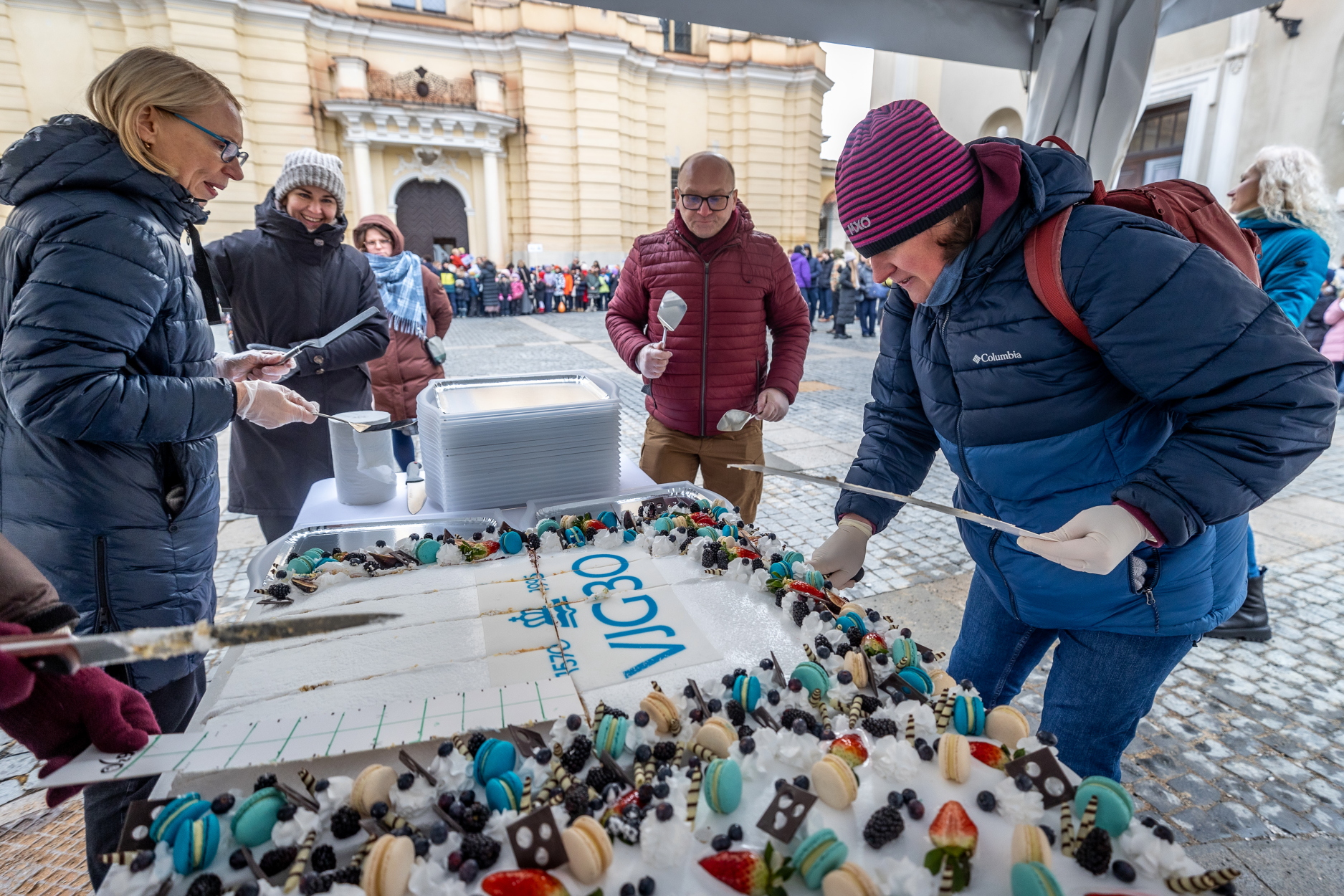 Kovo 3-ąją visa mokinių ir mokytojų bendruomenė organizuota eisena patraukė iš gimnazijos į katedrą. Išlaikėme organizavimosi ir tvarkos išbandymą, mums padėjo tėveliai-savanoriai ir policija. Vilniaus katedroje galėjome visi kartu sutilpti ir švęsti šv. Mišias, kurioms vadovavo arkivyskupas Lionginas Virbalas SJ. Jubiliejaus proga šv. Kazimierui paaukotas votas – auksinė širdis su karūna ir jėzuitų šūkiu. Skanioji šventės dalis laukė mūsų (istoriškai jėzuitiškame) Vilniaus universiteto Didžiajame kieme. Čia galėjome dalintis didžiuliu gimtadienio tortu.