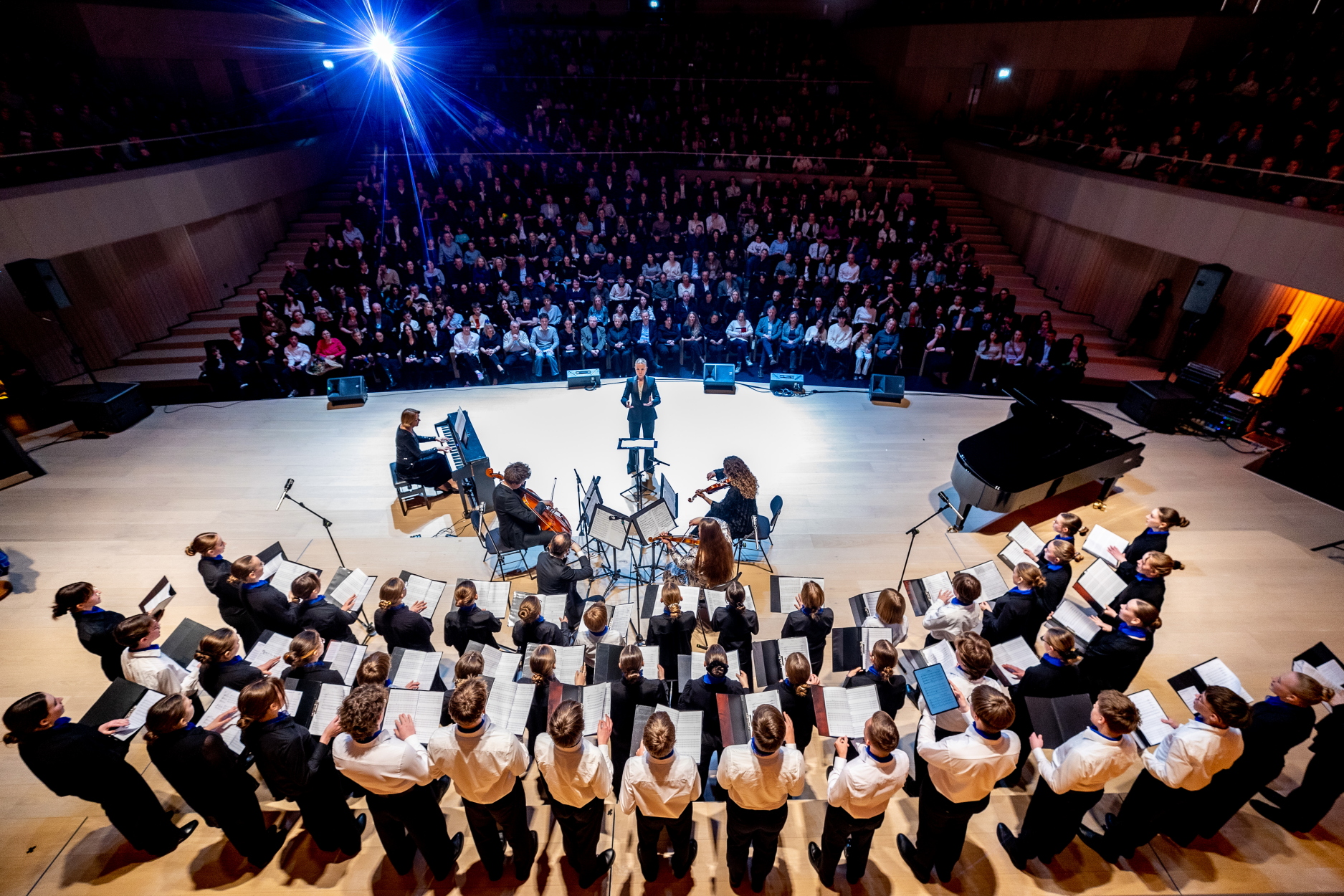 Koncerto pabaigoje nuskambėjo Vilniaus jėzuitų gimnazijos himnas – Justino Ritausko (Leonido Abario) muzika ir Danės Lapinskienės žodžiai. Atliekant himną susijungė trys chorai - mokinių mišrus choras „Krantas“, Mokytojų ansamblis, vadovaujamas Dovilės Mačiukaitės-Krasauskienės, tėvų bendruomenės choras „Muzikinis eksperimentas“, vadovė Roberta Dubinkaitė-Jakutienė, taip pat prisijungė ir kiti koncerto atlikėjai.